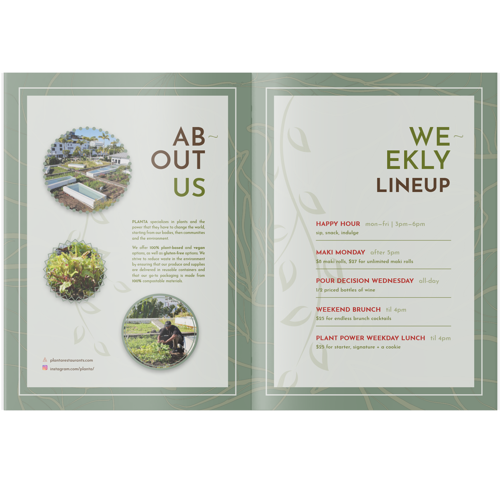 For this project, I was tasked to redesign the menu and facade for a local vegan food service. I chose to redesign the menu of a restaurant chain called PLANTA. The goal is to redesign the new menu and facade in a new, fresh way, while aligning with their plant theme. It has to highlight PLANTA's mission, which is to increase the accessibility and acceptability of plant-based dining. It is important to make plant-based cuisine look appetitizing and appealing. The final part of this project to to design a third application in which it has to coexist with the look and feel of the rest of the redesign.